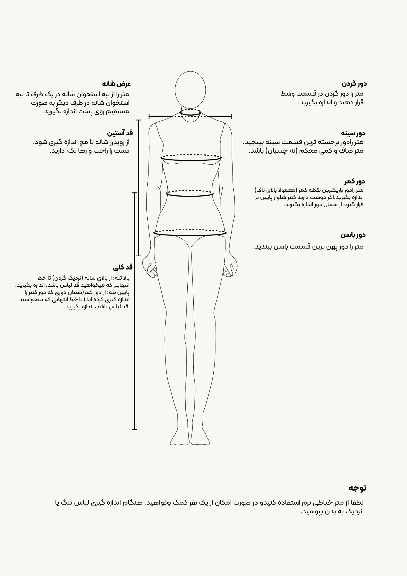 ﻟﻄﻔﺎً از ﻣﺘﺮ ﺧﯿﺎطﯽ ﻧﺮم اﺳﺘﻔﺎده ﮐﻨﯿﺪ و در ﺻﻮرت اﻣﮑﺎن از ﯾﮏ ﻧﻔﺮ ﺑﺮای ﮐﻤﮏ ﺑﺨﻮاھﯿﺪ. ھﻨﮕﺎم اﻧﺪازهﮔﯿﺮی ﻟﺒﺎس ﺗﻨﮓ ﯾﺎ ﻧﺰدﯾﮏ به ﺑﺪن ﺑﭙﻮﺷﯿﺪ.